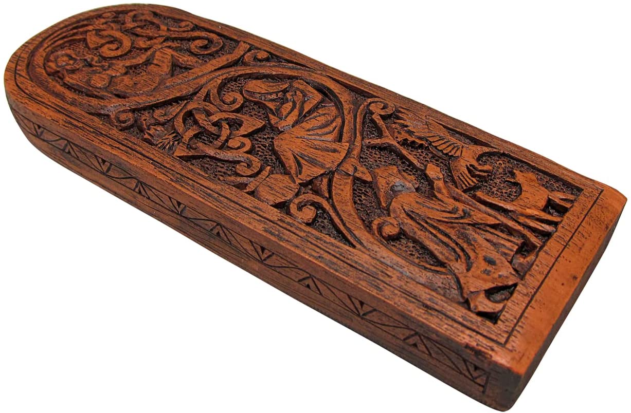 This plaque shows the three stages of a woman's life and depicts the Goddess in her three aspects as Maiden, Mother and Crone. The Maiden is full of life, sensuality and potential. The Mother is creativity, fertility and bringing forth life. The Crone is the attainment of wisdom gained from experience. Some refer to them by the titles Love, Life and Wisdom. Measures 3" x 7¾".