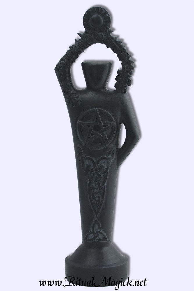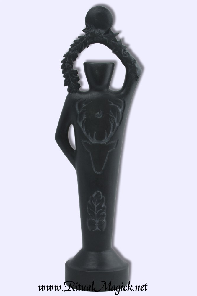 Lord of the Night. Protector of Hidden Mysteries. One side shows pentacle and Celtic knotwork designs with a sun disk overhead. The other contains the virile oak leaf with acorns, stag’s head and crescent moon, with a moon disk above. Symbols evoke power, wisdom, and connection with life energy. Designed by Abby Willowroot. Measures approx. 8¾”. Resin statue with black antique stone color finish.