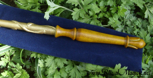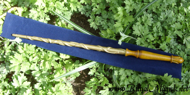 This wand features hand carved vines in a lovely golden color. Includes a wand storage pouch. The pouch color & style may vary from the picture shown. Measures approx. 14½” in length.
