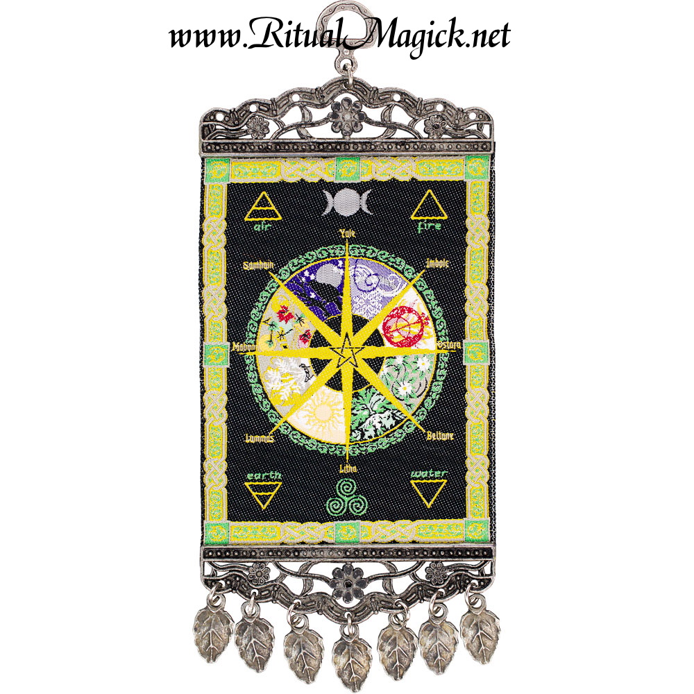 This stunning Turkish mini-carpet wall hanging features the Pagan wheel design. Both ends of the carpet are enclosed in an intricately detailed antiqued metal frame with matching hanging hook. Tear drop metal tassels adorn and complement the bottom (charms may vary from picture). The Pagan wheel is a symbolic calendar, highlighting the important seasons and festivals. Hang this beautiful piece on the walls of your home, office or favorite sacred space to be reminded of the importance and beauty of all the seasons. Overall measurements: 10″ x 4″.
